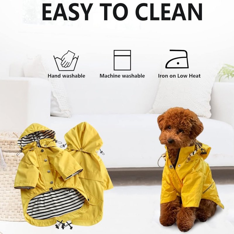 2: Dog raincoats for small dogs – Raincoat for dogs with additional buttons makes putting this coat on easy, stylish and cute. You can roll up the sleeves for short legs dog to show off the stripes that match with the inside or the hood. So cool! Completely water resistant and will keep your dog warm and dry in all weather conditions. Special rain day this puppy raincoat work very well!