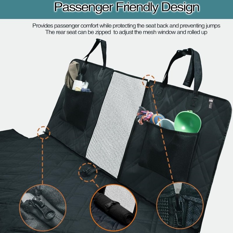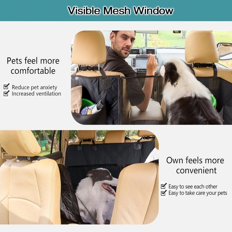 UNIQUE DESIGN: dog seat cover with breathable mesh is great for the air to flow into the back to keep your dog cool and warm. You can focus on the activities of both the pets and owners in the car. There are zippers on both sides of the mesh window that allow you to open the mesh window for easy interaction with your dog. Around the mesh surface, there are two storage bags, which can store pet items or personal items.