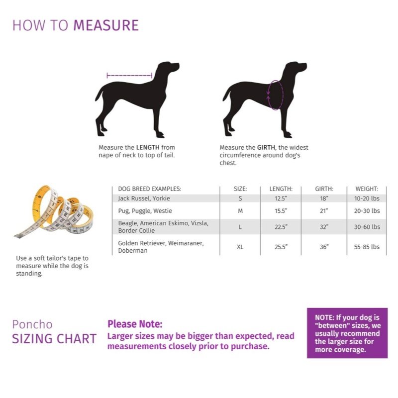 Sizing: Length measurements taken from base of hood to longest point on coat | Small size fits pets 12.5″ in length | Medium fits pets 15.5″ in length | Large fits pets 22.5″ in length | X-Large fits pets 25.5″ in length